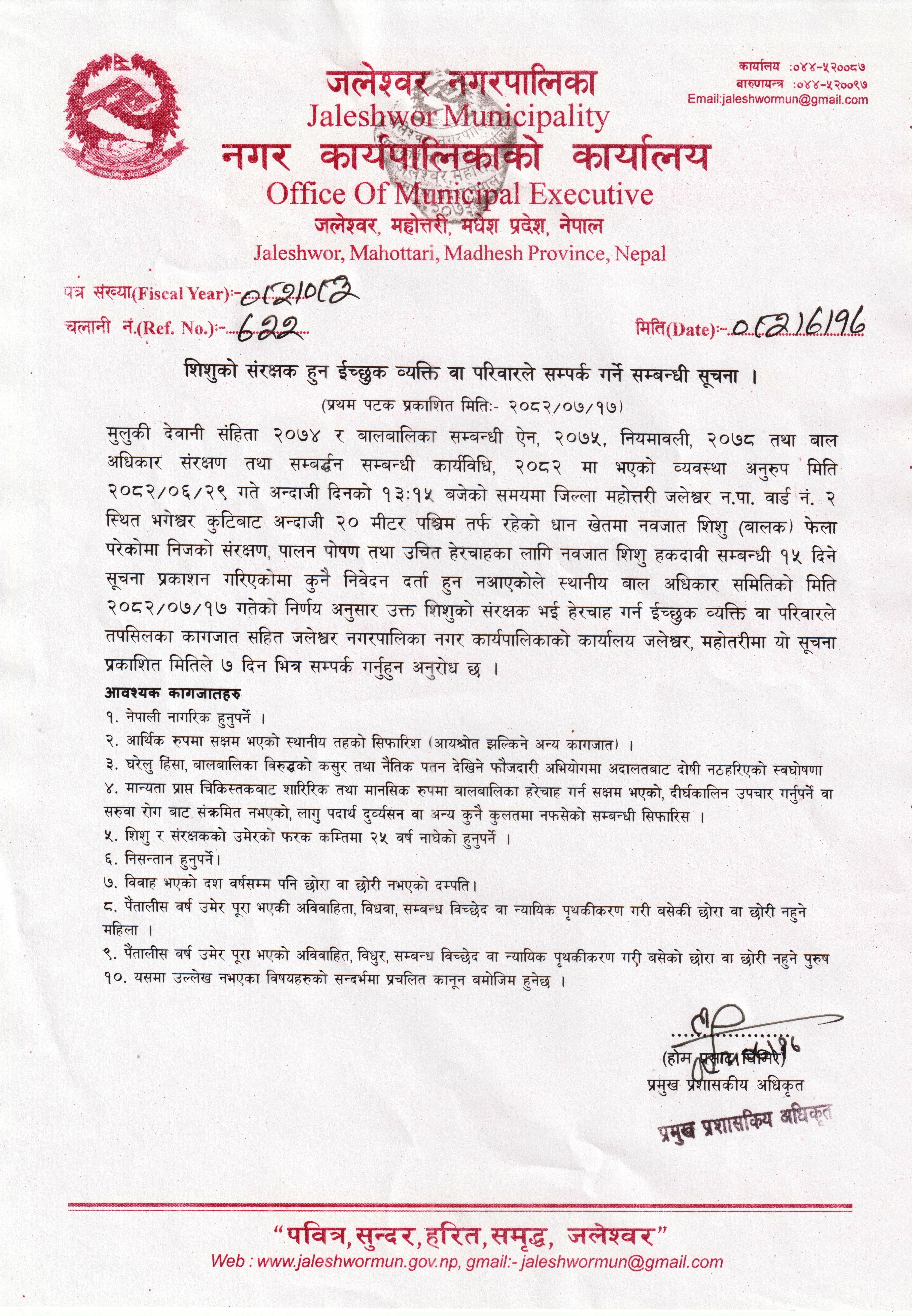 » शिशुको संरक्षक हुन ईच्छुक व्यक्ति वा परिवारले सम्पर्क गर्ने सम्बन्धी सूचना